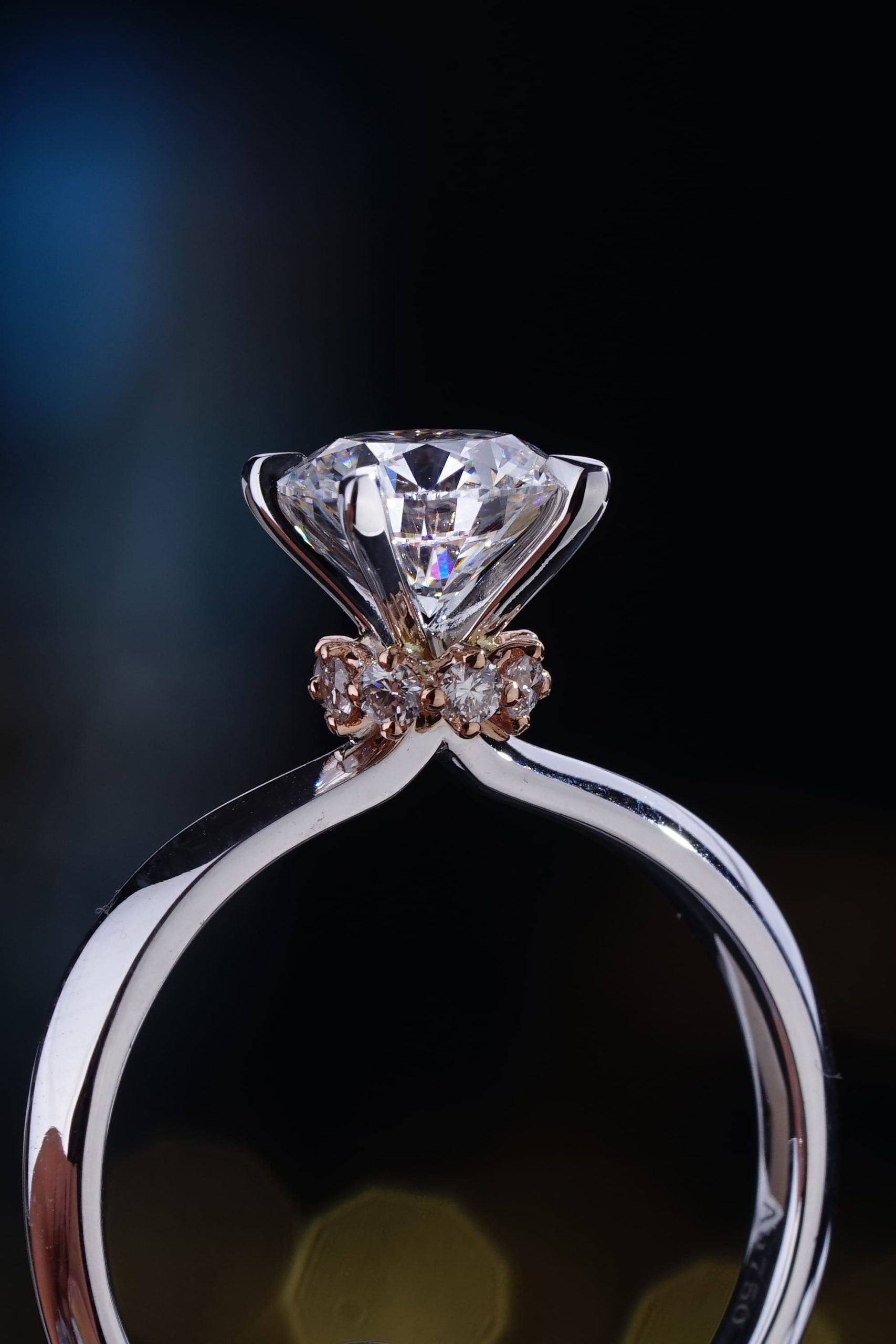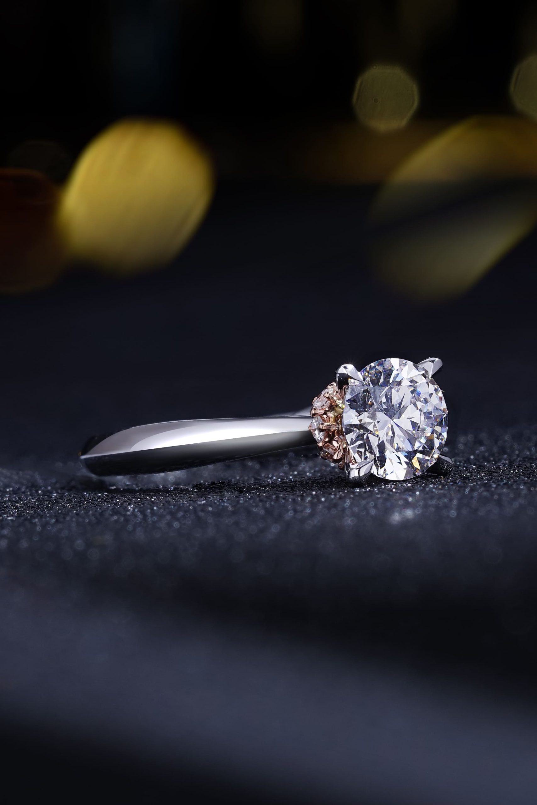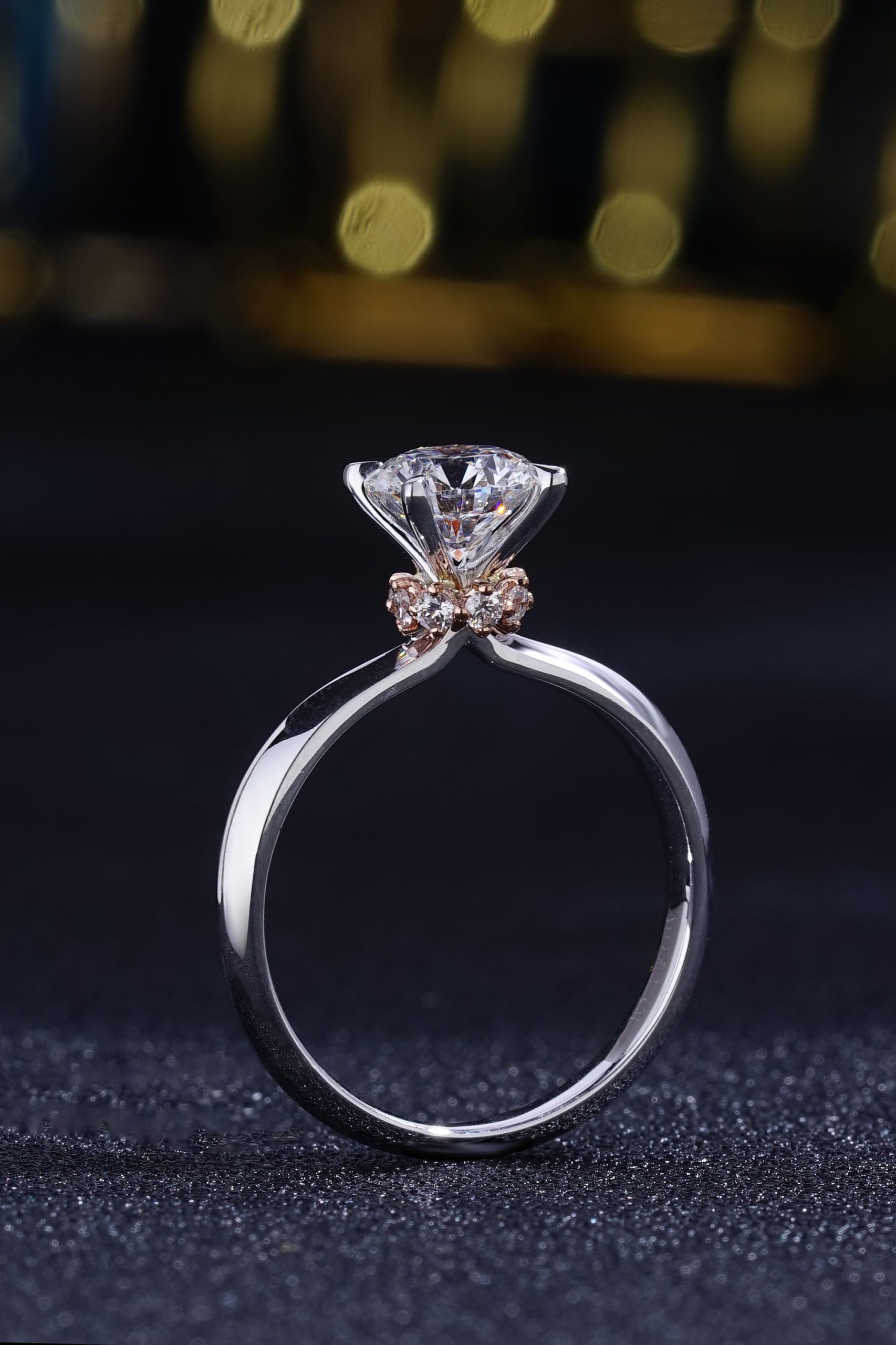 The V solitaire in 18k white gold with a round brilliant diamond, and pave with 18k yellow gold under the centre stone.
